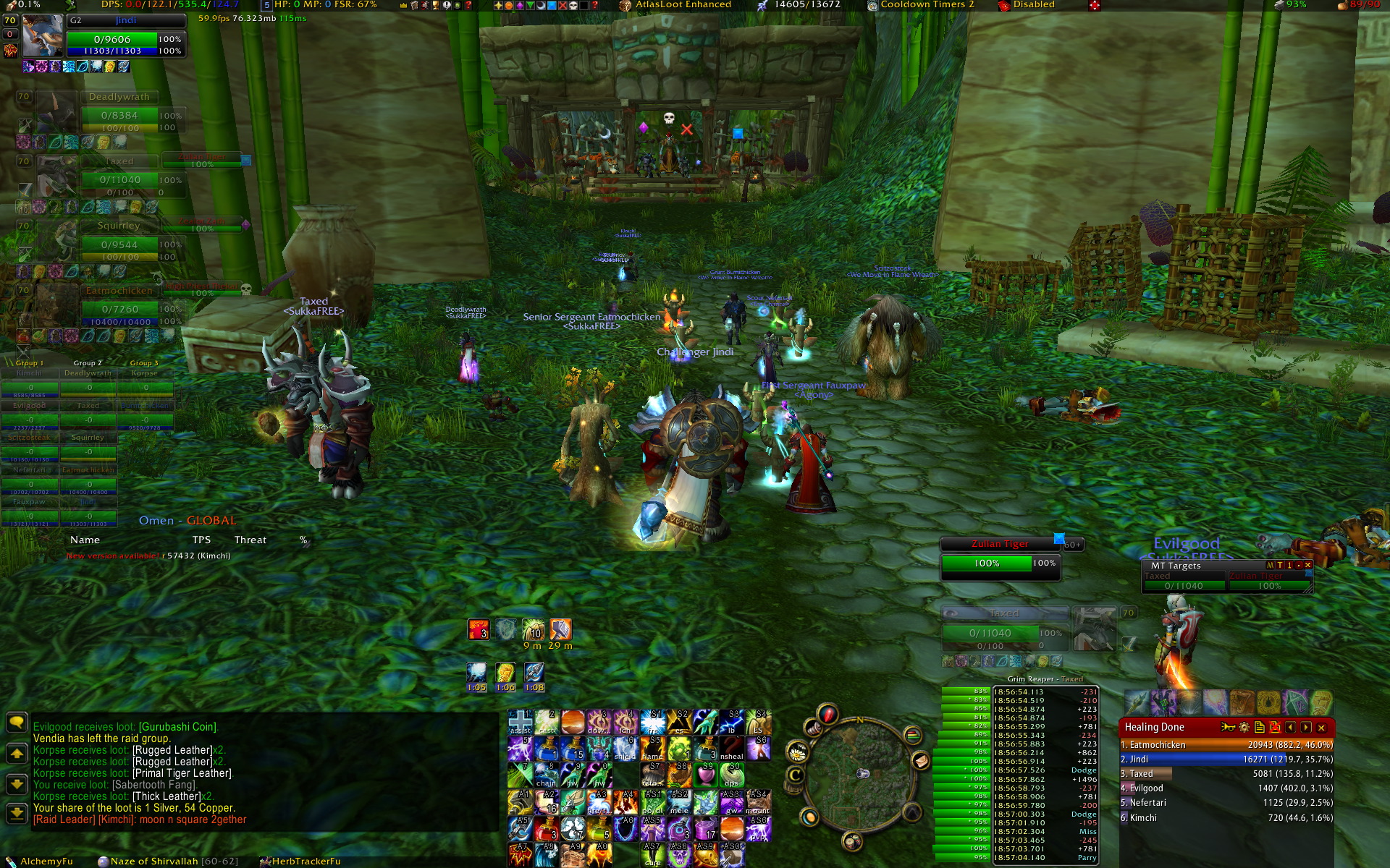 Meteor slash also does direct fire damage to whichever soak group takes it. Thinking about the forms of damage intake pretty much suggests how to utilize various healing classes. Pallies / priests are typically bombing the tank for stomp, with downranked heals between stomps. Resto druids are great for healing burn targets, as their HoTs can counter the burn DoT until about the last 10 seconds or so of the burn duration. In general, HoTs on the tank are not going to make a huge difference due to the extremely spiky nature of the tank damage. My primary role was to help see burn victims through the end of their DoT, when it’s ticking really hard. At other times, I was healing the soak groups via bouncing chain heals off the nearby tank, which also provided extra (and needed) healing on the tanks.